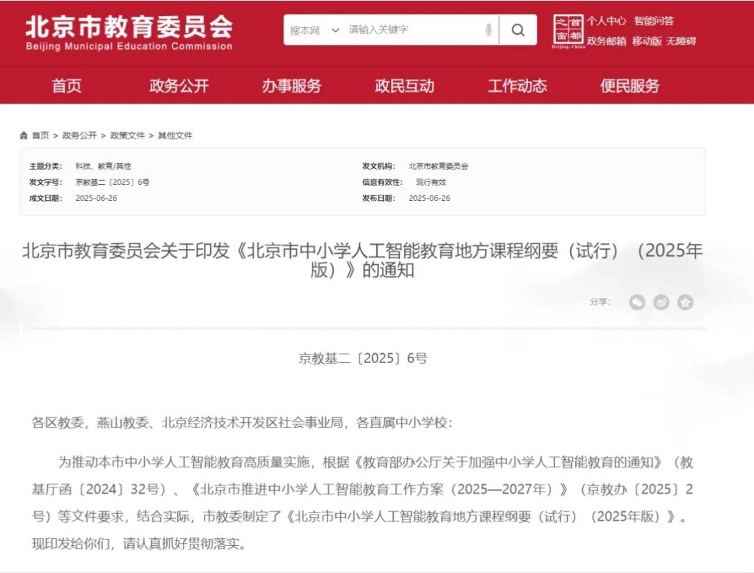 北京市教育委员会将于2025年秋季学期起,在全市中小学校推广 “人工智能通识课程”,每学年不少于8课时,课程覆盖小学至高中全学段。