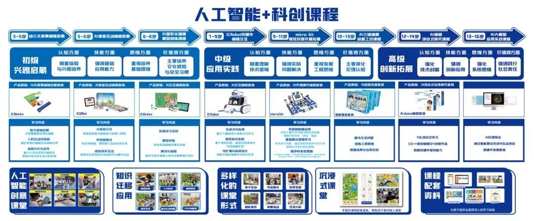 为了让不同年龄段的孩子都能获得适配的 AI 教育,艾克瑞特对课程体系进行全方位升级,依据教育部 “低段感知体验、中段理解应用、高段创新创作” 的要求,打造阶梯式成长路径,让孩子从 “玩 AI” 到 “用 AI 创造”,每一步都扎实进阶: