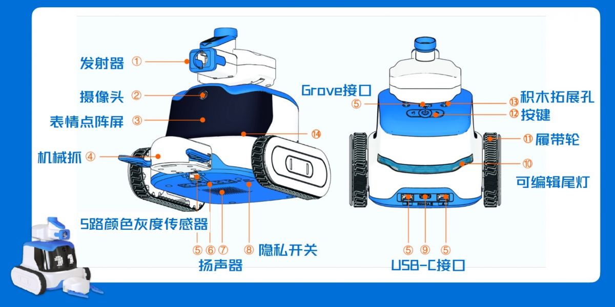 贴心的 Grove 接口与 5 路颜色灰度传感器的设计:Grove 接口支持快速连接拓展组件,课堂上能轻松开展 “传感器升级实验”;颜色灰度传感器则可用于 “追踪彩色线路”“识别物体颜色” 等趣味任务,孩子在调试传感器参数的过程中,会自然理解 “AI 如何通过数据感知世界”,把被动听课变成主动探索。