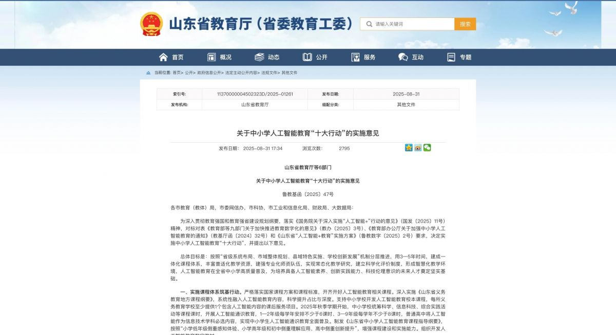 近日,山东省教育厅等 6 部门印发实施《中小学人工智能教育 “十大行动” 的实施意见》,聚焦基础教育阶段,对高质量推进人工智能教育作出系统部署。这一举措是应对人工智能时代教育变革的战略之举,也是推动山东基础教育现代化的关键步骤。