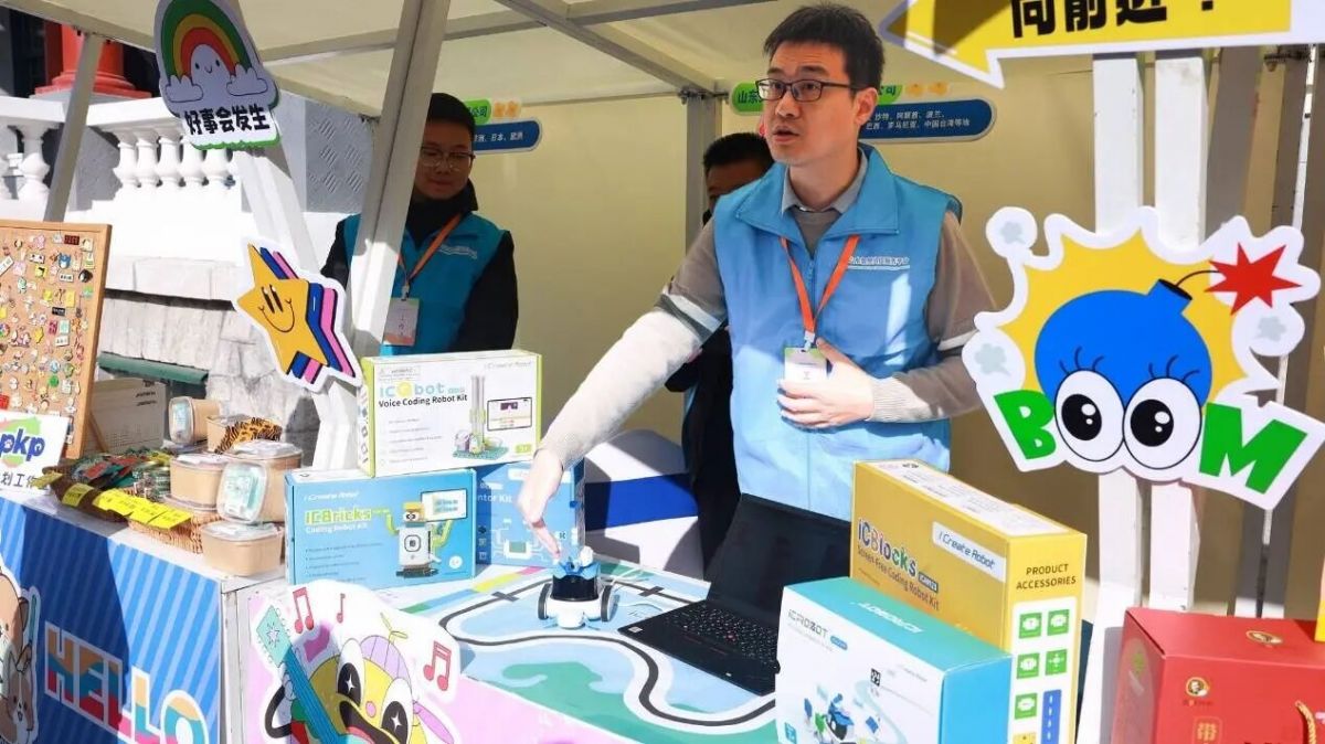 此次活动,市中区有3家企业参展,其中山东艾克瑞特教育科技有限公司国际贸易总监安国栋介绍“这款产品我们出口到美国、阿联酋、沙特、波兰、巴西等主要国家,适合于3岁以上的小朋友们来使用。我们提供了一个磁吸的无屏编程板,而且它可以使用这种实物的模块,启蒙孩子们的编程思维。我们用最优惠的价格带给我们所有的市民小朋友们,让他们能够体验到这种智能玩具的乐趣。”