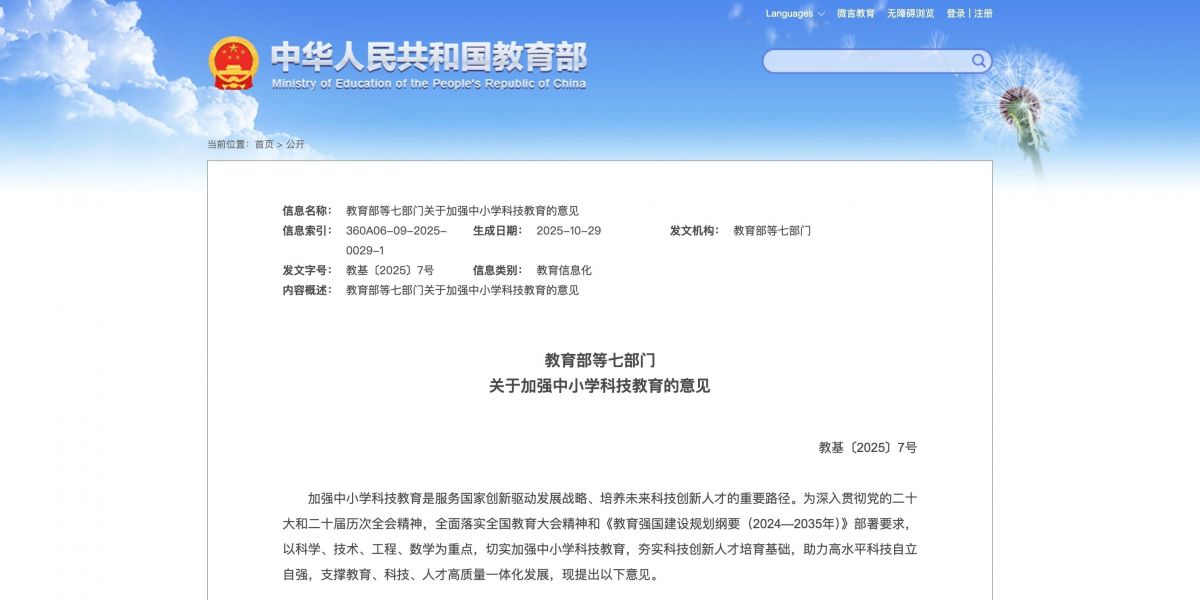 近日,教育部、中国科协等七部门联合印发《关于加强中小学科技教育的意见》(以下简称《意见》),提出以科学、技术、工程、数学为重点,切实加强中小学科技教育,夯实科技创新人才培育基础,助力高水平科技自立自强,支撑教育、科技、人才高质量一体化发展。