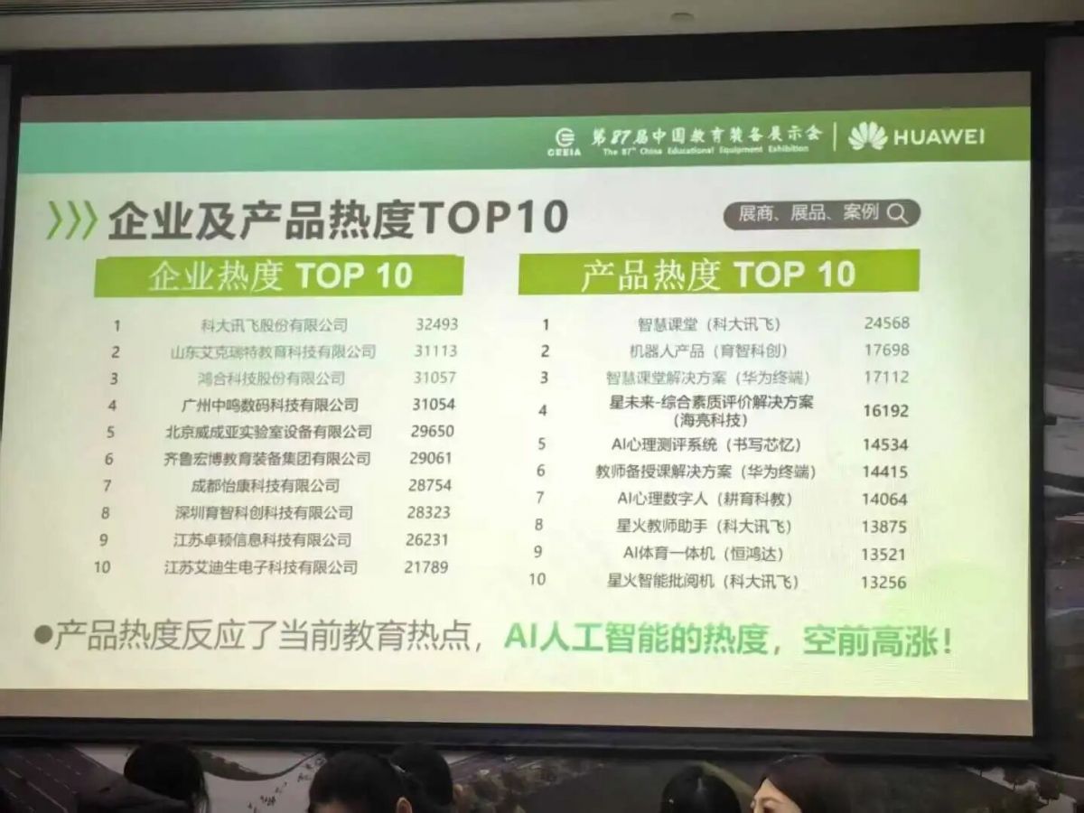 榜单显示,科大讯飞、山东艾克瑞特教育科技有限公司、鸿合科技在“AI人工智能企业热度”中位列全国前三,成为本届展会最受瞩目的科创教育企业代表。