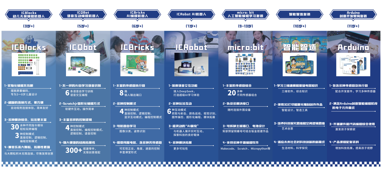 基于多年教学实践与自主研发积累,艾克瑞特构建了覆盖AI启蒙、交互体验、通识学习、工程实践、项目探究等多个层级的人工智能科创产品矩阵,形成面向幼儿园—小学—初中—高中的AI教学产品“全家桶”。