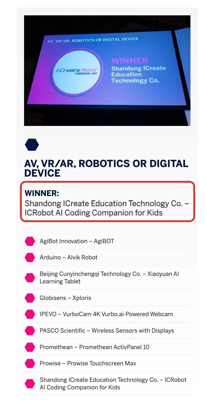在竞争极为激烈的AV、VR/AR、Robotics or Digital Device赛道中,ICRobot获得评委一致最高分(Unanimous Top Place),充分体现了其在产品成熟度、教学适配性与综合价值方面的国际领先水平。