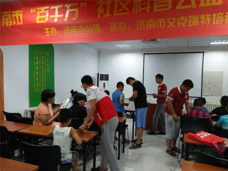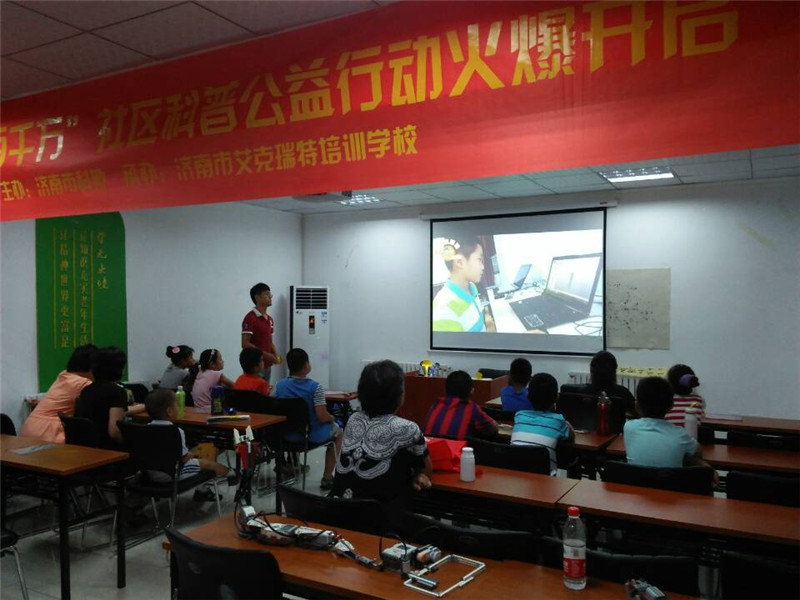 2016年8月12日由济南市科协、市中区科协主办,艾克瑞特机器人教育集团承办的济南市“百千万”社区科普公益行动走进春元里社区,艾克瑞特振华校区的老师们给孩子们带去了各类好玩的乐高机器人、3D打印作品以及春晚同款阿尔法机器人。孩子们在欢乐中学习了机器人知识,并且亲手制作了一把乐高手枪,比赛场面异常热烈。深深的吸引了孩子们的注意力,激发了孩子对科技的浓厚兴趣。