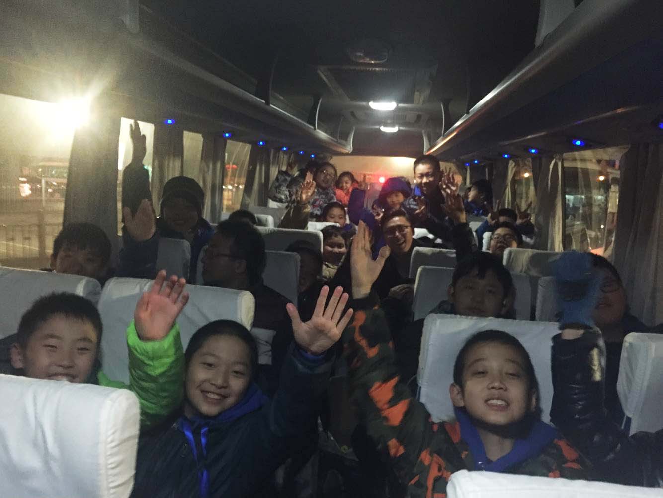 乘坐大巴车前往比赛场地。小工程们看起来都元气满满。